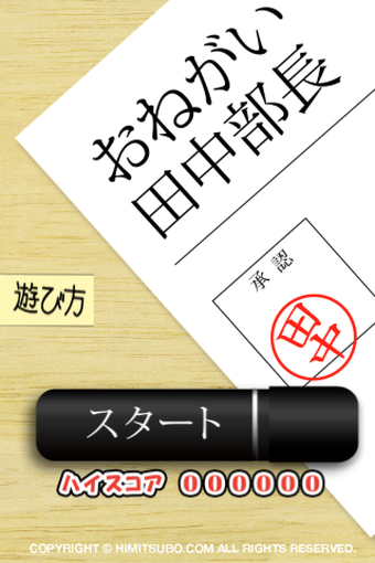 田中部長は、あなたが「田中部長」になって差し出される書類に向かってひたすらハンコを押す無料アクションゲームです。何も難しく考えることはなくただ向きを揃えて押すだけのゲームです。極端に単純なゲームですが、バシッと正しい位置にハンコが決まった快感に思わずはまってしまうことでしょう。一人でスキマ時間に楽しんで腕を磨いたり、友達同士(特に田中君を交えて)でやってみても盛り上がることでしょう。